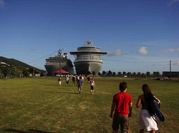 Navios cruzeiros atracam no estreito píer (marcador azul) de Tortola.